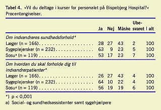 Af Tabel 4 fremgår det, at en forholdsvis stor andel af lægerne (43%) svarede, at de måske havde interesse i at deltage i kurser. Flest blandt sygeplejersker og dernæst social- og sundhedsassistenter udviste interesse for kurser om henholdsvis indvandreres sundhedsforhold og om, hvordan man forholder sig til indvandrerpatienter. Der var formuleret to spørgsmål om kursusdeltagelse, på hvilke hhv. 63% og 64% af sygeplejerskerne svarede bekræftende (Tabel 4), mens hhv. 53% og 56% af social- og sundhedsassistenterne svarede bekræftende, og kun hhv. 28% og 26% af lægerne svarede bekræftende (Tabel 4).