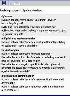 Den kvalitative interviewundersøgelse blev udført primo 2008 af en antropolog. Interviewene tog udgangspunkt i en på forhånd udarbejdet interviewguide, som imidlertid var åben over for at forfølge relevante emner, som den enkelte interviewperson tog op (Tabel 1 ) [4, 5]. Interviewene blev optaget, transskriberet og efterfølgende kodet ud fra centrale temaer, som førte til analysen [6], herunder forløbshastighed, kommunikation og information.