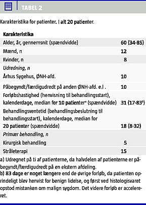 I alt 20 hoved-hals-kræft-patienter, der var i behandling på Århus Sygehus, blev interviewet (Tabel 2 ). De patienter, som både var udredt og behandlet på Århus Sygehus, havde et forløb på mediant 31 kalenderdage, og ni ud af ti havde et samlet forløb på under 42 dage fra henvisning til Øre-næse-halsafdelingen på Århus Sygehus til behandlingsstart. Ti af patienterne var påbegyndt udredning eller færdigudredt på en anden øre-næse-halsafdeling eller lignende, hvorfor udredningstiden for denne gruppe ikke er repræsentativ for hele udredningsforløbet. Patientforløbene kvalificerede dog alle som accelererede udrednings- og/eller behandlingsforløb.