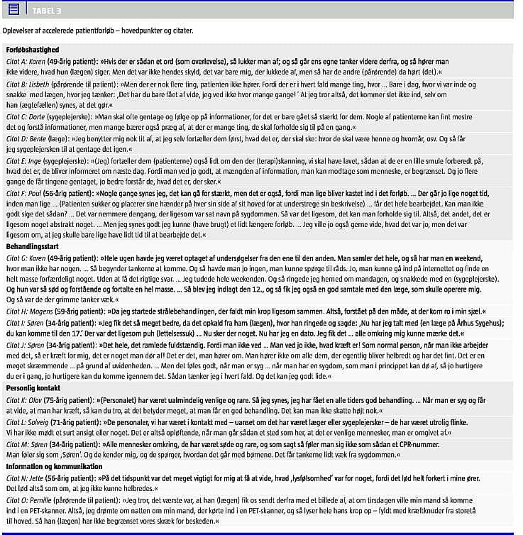 Patienterne udtrykte stor tilfredshed med de accelererede patientforløb. Samtidig fremgik det både af interview og observationer, at det var svært for patienterne at følge med både mentalt og følelsesmæssigt samt at huske og forstå praktiske informationer vedrørende undersøgelses- og behandlingsforløbet. Specielt udredningsforløbet og perioden frem til behandlingsstart var karakteriseret ved at være kaotisk for patienterne. Flere patienter beskrev oplevelser af kun at høre eller hæfte sig ved enkelte ord fra samtaler med lægen, fordi de ufrivilligt lukkede af over for det, der blev sagt (Tabel 3 , citat A). I interviewsituationerne havde patienterne tillige svært ved at genkalde sig og adskille de forskellige dele af forløbet.