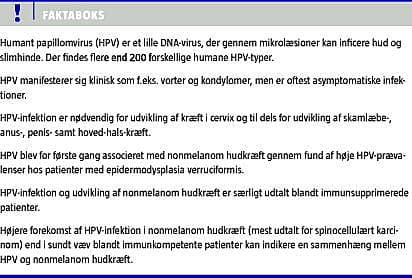 Humant papillomvirus (HPV) er nødvendig for udvikling af kræft i cervix og er også involveret i skamlæbe-, penis- og hoved-hals-kræft. Det er mere uklart, hvad HPV-infektion betyder for nonmelanom hudkræft (NMH). Ved en systematisk litteraturgennemgang gennemgås data fra perioden 1996-2010 om HPV-prævalensen hos immunkompetente personer med NMH. I denne artikel påvises, at HPV-infektion, herunder multiple HPV-typer, er mere udtalt hos personer med NMH, specielt i spinocellulært karcinom (SCC) i forhold til basocellulært karcinom og sundt væv, hvilket kan indikere en sammenhæng mellem HPV og SCC hos immunkompetente personer.