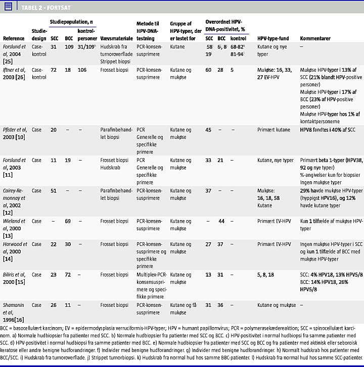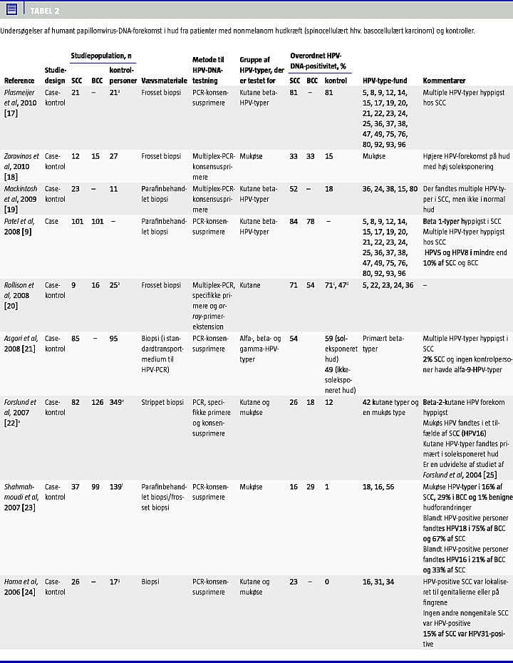 Der er i alt lavet otte casestudier [9-16] og ti case-kontrol-studier [17-26] i undersøgelsesperioden (1996-2010) (Tabel 2). Overordnet lå HPV-prævalensen hos personer med SCC på 13-84%, hos personer med BCC på 8-78% og hos kontrolpersonerne på 0-94%. I seks ud af ti case-kontrol-undersøgelser fandt man en højere forekomst af HPV-DNA i biopsier fra NMH end i biopsier taget i sund hud fra patienter med NMH eller fra kontrolpersoner [18, 19, 22-24, 26]. Blandt de 11 undersøgelser, hvor både personer med SCC og personer med BCC var inkluderet, var HPV-prævalensen højest hos personer med SCC i fem undersøgelser [9, 11, 20, 22, 26], i fire var den højest hos personer med BCC [14-16, 23], i én undersøgelse var prævalensen den samme hos personer med SCC som hos personer med BCC [18]. Endelig varierede fundet af den højeste prævalens med målemetoden i én undersøgelse [25]. I nogle undersøgelser fandt man en højere prævalens af multiple HPV-typer hos personer med SCC end hos personer med normal hud eller med BCC [9, 17, 19, 21]. Der er primært fundet betakutane HPV-typer hos personer med NMH, men i nogle undersøgelser er der også fundet andre kutane typer og tillige mukøse HPV-typer. Kutant HPV-DNA er fundet primært på soleksponerede hudområder [18, 22].