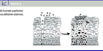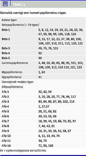 HPV er et lille DNA-virus, der igennem mikrolæsioner i huden inficerer epitelets basalcellelag og herfra initieres viral intracellulær replikation (Figur 1) [7]. Der er identificeret flere end 200 forskellige HPV-typer [8], og 120 humane HPV-typer er kortlagt. HPV er klassificeret i fem fylogenetiske grupper, der omfatter alfa-, beta-, gamma-, my- og nypapillomvirus (Tabel 1 ). HPV-typer opdeles i kutane og mukøse typer. De kutane typer omfatter såkaldte epidermodysplasia verruciformis (EV)-relaterede HPV-typer (særlig i beta 1- og beta 2-gruppen) og andre kutane typer (beta-, gamma-, my- og ny-papillomvirus) [8]. De mukøse HPV-typer er indeholdt i alfagruppen og kan opdeles i høj- og lavrisiko-HPV-typer i relation til deres onkogene potentiale; især HPV16 og HPV18 besidder et stærkt onkogent potentiale [7, 8]. HPV-infektion med såvel kutane som mukøse HPV-typer er almindeligt forekommende, og disse infektioner er oftest asymptomatiske, men kan manifestere sig klinisk som benigne forandringer i form af vorter på hænder og fødder forårsaget af infektion med bl.a. HPV1, HPV2 eller HPV4 eller som genitale vorter (kondylomer), hyppigst forårsaget af HPV6 eller HPV11 [8].