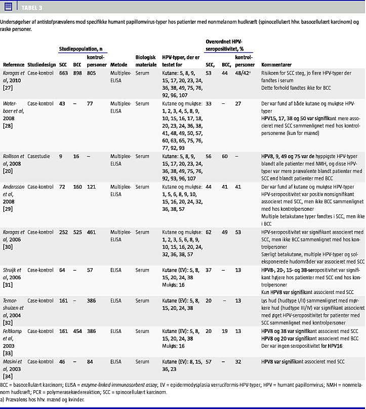 I studieperioden er der lavet ét casestudie [20] og otte case-kontrol-undersøgelser [27-34] af HPV-seropositivitet i relation til NMH (Tabel 3). Hos patienter med SCC var der en overordnet HPV-seropositivitet på 20-62%, hos patienter med BCC var den på 19-60%, og for kontrolpersonerne var den på 13-53%. I alle otte case-kontrol-undersøgelser fandt man en højere prævalens af HPV-seropositivitet hos patienter med SCC end hos kontrolpersonerne [27-34], hvorimod man i tre ud af fire undersøgelser, der inkluderede patienter med BCC, ikke fandt højere prævalens af seropositivitet hos disse end hos kontrolpersonerne [27, 29, 30]. F.eks. fandt man i den til dato største undersøgelse [27], der inkluderede 663 patienter med SCC, 898 patienter med BCC og 805 kontrolpersoner fra den generelle befolkning, en øget risiko (oddsratio (OR) på 1,3 (95% konfidens-interval (KI): 1,04-1,61) for SCC hos personer, der var beta-HPV-seropositive, mens risikoen for BCC ikke var øget (OR = 0,97; 95% KI: 0,80-1,19). Endvidere steg risikoen for udvikling af SCC med seropositivitet over for et stigende antal HPV-typer, men ikke for BCC [27]. I de fem undersøgelser, som inkluderede både SCC og BCC, var prævalensen af HPV-seropositivitet højere hos patienter med SCC end hos patienter med BCC i tre af undersøgelserne [27, 29, 30].
