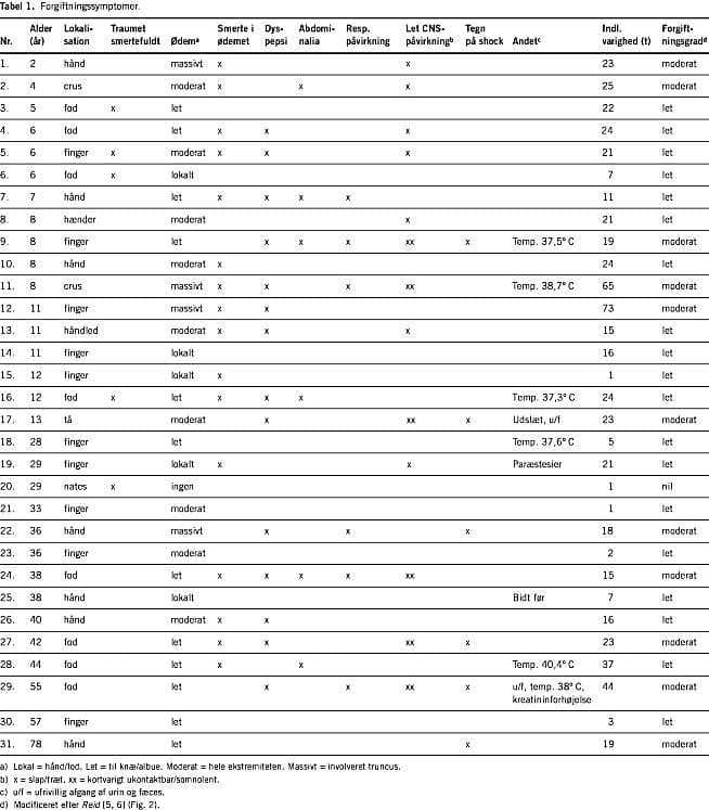 Results: A total of 31 patients between two and 78 years of age were admitted to the hospital. 55% were 13 years old or less. Thirty of the patients were tourists in the area. The patients stayed in hospital for 20 hours on average. Common symptoms were edema, pain, nausea and signs of shock. 35% were moderately poisoned, the remaining were less affected. Symptomatic treatment was sufficient.