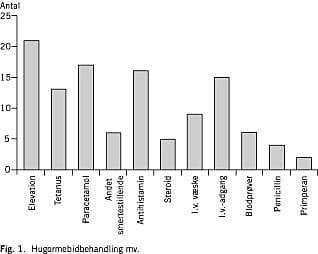 I Fig. 1 ses en oversigt over behandling mv. Den bidte ekstremitet blev holdt i ro og eleveret, 13 fik tetanusrevaccination. Sytten fik paracetamol, og i alt seks patienter fik tillige tramadol, codein eller et non-steroid antiinflammatoric drug (NSAID)-præparat. Halvdelen af patienterne fik antihistamin, og fem fik steroid samt intravenøse væsker. Ingen fik antiserum/antistof.