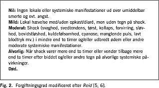 I Fig. 2 gengives klassifikationen af graden af forgiftning modificeret efter Reid [5, 6]. Benyttes denne klassifikation på nærvæ rende undersøgelse, var 35% moderat forgiftede, og ingen var svært forgiftede. I andre undersøgelser skønnes, at 20-30% af de patienter, der bliver indlagt med hugormebid, får moderate til svære forgiftninger. Dødsfald er sjældne, men forekommer [1, 2, 6].