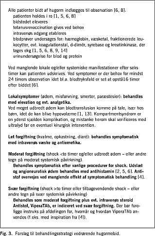 Diskussion: Indlæggelsestiden var kortere end i andre opgørelser. Antibiotika og antihistamin blev anvendt - som i andre undersøgelser - oftere end det anbefales i litteraturen. Alle, der bliver bidt, bør indlægges til observation i mindst seks timer og have anlagt en intravenøs adgang, der bør desuden laves laboratorieundersøgelser. Efter relevant tetanusrevaccination kan patienter uden symptomer udskrives. Patienter med symptomer bør observeres i mindst 24 timer. Behandlingen er symptomatisk. Et oprenset antistof, ViperaTAb er mindre allergent end de antisera, vi hidtil har kunnet anvende, og bør anvendes ved svære forgiftninger.