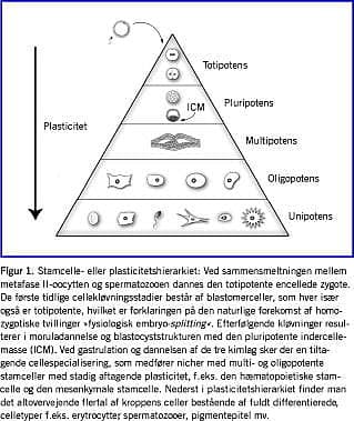 En stamcelle defineres som en celle, der er i stand til at forny sig selv i udifferentieret form samtidig med at kunne give ophav til en eller flere mere differentierede datterceller [9]. Der kan herske nogen tvivl om antallet og karakteren af stamcelletyper, og det er derfor vigtigt at slå fast, at der findes flere typer af stamceller med hver deres karakteristika. Disse forskelle illustreres måske bedst ved at behandle den embryonale udvikling (Figur 1): Ved fusionen mellem den ovulerede metafase II (MII)-oocyt og spermatozooen dannes den encellede totipotente zygote. Zygoten indeholder dermed det komplette arvemateriale, som alle senere deriverede celletyper (med få undtagelser) vil indeholde en identisk kopi af. Zygoten og cellerne i de meget tidlige cellekløvningsstadier (blastomerer) betegnes som totipotente, idet de giver ophav til det egentlige foster såvel som de strikt ekstraføtale væv i placenta (ydre chorion). Efter en række yderligere celledelinger har det tidlige embryon antaget karakter af en blastocyst. Denne væskefyldte struktur består af en ydre »skal« af differentierede trofoblastceller, der bliver til placenta, og en indre cellemasse (ICM) bestående af 100-200 embryoblastceller. Det er cellerne i ICM, som giver ophav til det egentlige foster med dets histo- og organogenese, dvs. at disse celler potentielt kan give ophav til samtlige celletyper i kroppen, såkaldt pluripotens. Efter begyndende cellespecialisering med dannelsen af de tre kimlag (ektoderm, mesoderm og endoderm) ved gastrulation accelererer den mere specialiserede celledifferentiering og egentlige organogenese. Efter fuldendt histo- og organogenese vil organismen dog indeholde nicher af såkaldte adulte stamceller, som fremover vil fungere som kroppens reservelager, og som i hver sin niche vil erstatte udtjente specialiserede celler. Differentieringsgraden af adulte stamceller er omdiskuteret, men konsensus synes at være, at de kun kan give ophav til et mindre antal af specialiserede celler inden for samme kimlag. Den hæmatopoietiske stamcelle (HSC), der giver ophav til såvel myeloide som lymfoide forstadier til blodets formede legemer, er det klassiske eksempel på en adult stamcelle. Der er dog også beskrevet adulte stamcellenicher i bl.a. huden, leveren og centralnervesystemet. Begrebet stamceller dækker således over en temmelig heterogen gruppe af celler, som er ordnet i et egentligt stamcellehierarki med faldende differentieringskapacitet (plasticitet) korreleret til tidspunktet for deres dannelse under embryogenesen (Figur 1).