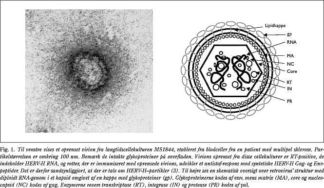 Vi har udført RT-PCR-undersøgelser af cellefrit plasma (som potentielt indeholder frie viruspartikler) fra MS-patienter og kontrolpersoner samt af oprensede virions fra supernatanter fra langtidsblodcellekulturer fra MS-patienter. Vi påviste HERV-H/RGH-2-homologe gag- og env- sekvenser udelukkende hos MS-patienterne (hos 70%). Vi fandt også HERV-H/RGH-2-homologe sekvenser i oprensede, revers transkriptasepositive virions fra MS-cellekulturerne (30-32). Med en optimeret oprensningsmetode (33) oprensede vi intakte virions (Fig. 1), som blandt andet er brugt til immunisering af rotter. De immuniserede rotter udviklede antistoffer, som reagerede med syntetiske HERV-H Gag- og Env-peptider (3), så eksistensen af egentlige HERV-H-virions er velunderbygget, selv om de enkelte HERV-H-kopier i den fuldt sekventerede del af det humane genom hver især har forskellige defekter.