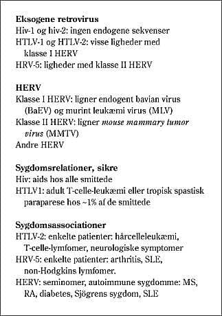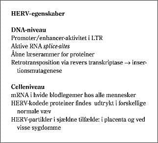 For HERV er det endnu sværere at klarlægge eventuelle sygdomsrelationer. HERV repræsenterer potentielt aktive patogene faktorer både som virus, som proteiner og som gener. Langt de fleste HERV må være uskadelige, eftersom de findes hos alle og i alle celler, og eventuel patologi vil være betinget af mange faktorer i både arv og miljø (se Boks 2 for HERV's egenskaber). En oversigt over interessante HERV-grupper er vist i Tabel 1 .