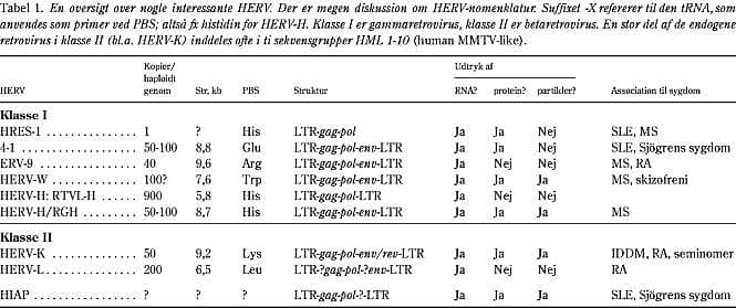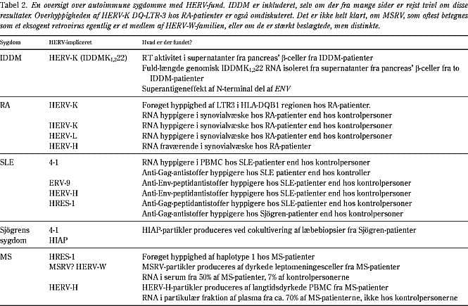 Proteiner fra endogene retrovirus udtrykkes i kimceller og embryovæv og kan her medvirke til induktion af tolerance under immunsystemets udvikling; mens aktivering af HERV til proteinudtryk eller ligefrem partikelproduktion senere i livet kan have patologisk betydning. Når man forsøger at vurdere, om HERV spiller en rolle som markører for eller medvirkende årsag til sygdom, er det derfor væsentligt at sammenholde sygdomsfund med situationen hos passende kontrolindivider (16). En oversigt over fund af HERV i autoimmune sygdomme findes i Tabel 2 .