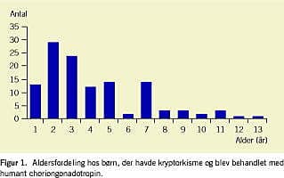 Konklusion: Succes af HCG-behandling ved kryptorkisme var på 34,7%. Der blev ikke fundet nogen aldersafhængighed af effekten af HCG, men testisplacering før behandlingen havde betydning for succesraten.
