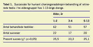 Ifølge Cortes et al [9] har hormonbehandling før fireårsalderen en yderst begrænset effekt på testikulær descensus, men ifølge metaanalysen [8] påvirker alderen, hvor hormonbehandlingen gives, ikke succesraten, når drenge under fire år og drenge over fire år sammenlignes, og ved sammenligning af hormonbehandlede drenge < 2 år og ældre drenge fandt man samme effekt [13]. I vores undersøgelse blev der heller ikke fundet nogen aldersafhængig effekt af HCG-behandlingen, så det må konkluderes, at de helt små børn også har effekt af behandlingen.