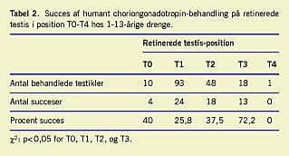 Resultater: I de 306 gennemgåede journaler blev der fundet 121 patienter, som opfyldte inklusionskriterierne. Samlet var der 170 retinerede testis. Den mediane alder ved behandling var 3,6 år. Den overordnede succesrate var 34,7%. Succes i de enkelte alderskategorier var: 1-2 år:36,7%, 3-4 år: 33,4% og 5-13 år: 35%. Testisplacering ved behandlingsstart viste, at jo mere distal placeringen var før behandlingen, jo større succes.