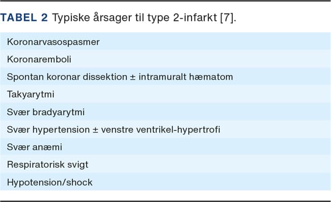 Det er vigtigt at understrege, at man vha. algoritmen ikke kan skelne mellem type 1- og type 2-infarkt, hvilket har terapeutisk betydning (Tabel 2) [6]. Generelt skal yderligere akut udredning ikke tilbydes til de patienter, hvor der på baggrund af de kliniske undersøgelser identificeres en mere sandsynlig årsag til symptomerne samt akut kardiomyocytskade end NSTEMI, og hvor yderligere diagnostiske undersøgelse ikke er nødvendige for at stille diagnosen f.eks. ved takyarytmi eller hypertensiv krise [5].