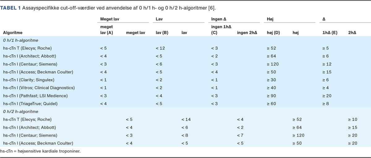 0 h/1 h-algoritmens afskæringsværdier afhænger af, hvilket assay man benytter, da de er assayspecifikke (Tabel 1). Nogle af afskæringsværdierne ligger under 99-percentilen for det givne assay, hvilket oftest ikke opgives ved svarresultatet, men dette er muligt uden at ændre på svartiden.