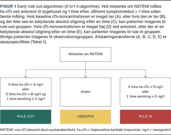 Ved algoritmen måles cTn-koncentrationen ved indlæggelse og en time efter, og ud fra specifikke afskæringsværdier triageres patienterne i tre grupper: rule out, hvor NSTEMI skønnes at være udelukket, rule in, hvor der er mistanke om NSTEMI, og observe, hvor NSTEMI-mistanken er usikker (Figur 1).