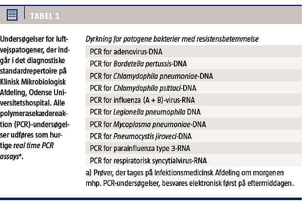 Ovenfor er beskrevet, hvorledes en nyetableret specifik analyse for MERS-CoV blev benyttet sammen med andre diagnostiske test til afklaring af tilstande, der var forenelige med infektion med MERS-CoV. Analysetiden er få timer, og undersøgelser for andre luftvejsvirus og bakterier kan udføres sideløbende med analyserne for MERS-CoV (Tabel 1). Derved kan ætiologien fastlægges, samtidig med at mistanken om infektion med MERS-CoV hurtigt kan afkræftes. Det er vigtigt at undersøge for patogener, der er aktuelle i forhold til smittestedet, når dette ligger fjernt fra Danmark. Hos patienten i sygehistorie I blev der påvist influenza B, som ikke forekom i Danmark på det pågældende tidspunkt.