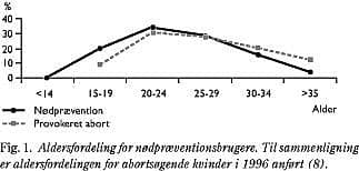 Vi fandt det ikke muligt at få det travle apotekspersonale til at registrere antallet af udleverede spørgeskemaer, ligesom vi ikke kan udelukke, at enkelte kvinder ikke er blevet præsenteret for skemaet, for eksempel fordi det ikke var kvinderne selv, der hentede pillerne. Formentlig vil nødprævention være den langt overvejende indikation for brug af 1 × 21 Neogentrol-tabletter, men det er muligt, at enkelte pakker er udleveret til andet formål. Disse forhold er medvirkende til, at den tillempede deltagerprocent på 51 formentlig er for lav. Det er selvfølgeligt muligt, at der er tale om en vis grad af selektion. På den anden side matcher aldersfordelingerne af nødpræventionsbrugerne og af kvinder, der har fået foretaget legale aborter, i Københavns Kommune i 1996 hinanden (Fig. 1), hvilket støtter, at vores studiepopulation er repræsentativ for kvinder, der har risiko for uplanlagt graviditet. Desuden peger sammenfaldet af aldersfordelingerne på, at et øget kendskab til nødprævention i målgruppen kunne reducere antallet af provokerede aborter.