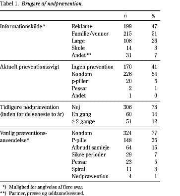 Resultater: Medianalderen var 24 år. De fleste (73 %) anvendte nødprævention for første gang. Kondomsvigt var den hyppigste årsag (54 %) til behovet for nødprævention, mens 41 % ikke havde forsøgt at anvende prævention. Kun seks kvinder (1,4 %) begrundede den manglende præventionsanvendelse med kendskabet til nødprævention, og kun fire kvinder (1 %) angav at anvende metoden som deres vanlige prævention. Kendskab til metoden stammede oftere fra familie/venner (51 %) og reklame (47 %) end fra egen læge (26 %) og skolens seksualundervisning (3 %). I alt 282 kvinder (69 %) fik udskrevet nødprævention via lægevagt eller skadestue.