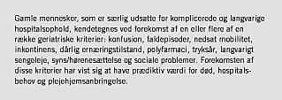 I de tidlige studier [13, 11, 14], som viste effekt af indlæggelse på geriatrisk afdeling, blev der anvendt omfattende eksklusionskriterier (svær demens, terminal sygdom, medicinsk sygdom uden yderligere behandlingsmulighed og ustabil medicinsk sygdom). Applegate et al [14] stratificerede de geriatriske patienter i en høj- og i en lavrisikogruppe i forhold til risiko for plejehjemsanbringelse. Gevinsten både hvad angik mortalitetsreduktion og forbedring i funktion var at hente i lavrisikogruppen, mens der ikke var signifikant forskel i højrisikogruppen.