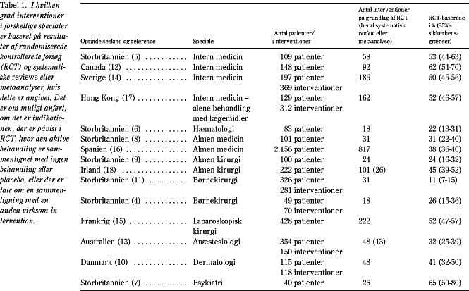 Resultater: Inden for intern medicin synes over 50% af interventionerne at bygge på randomiserede kontrollerede forsøg, mens dette tal er noget lavere inden for almen medicin, kirurgi, anæstesiologi og dermatologi. Psykiatri er i en meget lille undersøgelse topscorer med 65% af interventionerne på baggrund af randomiserede kontrollerede forsøg, hvorfor flere undersøgelser, som evt. kan bekræfte dette, efterlyses.