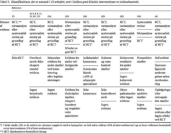 I flertallet af de gennemførte undersøgelser har man klassificeret evidensen i tre grader, som Ellis & al gjorde i den første undersøgelsesom I: evidens fra RCT, II: interventioner med overbevisende ikkeeksperimentel evidens og III: interventioner uden substantiel evidens (5). Især mellemgruppen er problematisk, idet den synes at være for rummelig, særlig når man som de fleste forfattere selv har været dommer over, hvorledes evidensen skulle fortolkes. Det er derfor langt mere hensigtsmæssigt at dele denne kategori op i ganske få indiskutable interventioner, såsom insulinbehandling til dårligt reguleret diabetes mellitus og de øvrige, hvor man har undersøgt, om der er almindelig konsensus om interventionen hos et antal eksterne specialister (14). Det ville være ønskeligt, at man anvendte en klassifikation af evidens, som den Ugeskriftet anvender for oversigtsarbejder. Denne klassifikation svarer til den, der er angivet af Eccles (21), som kan udvides til at omfatte observationelle studier og klassifikation af studier over diagnostiske test (22).