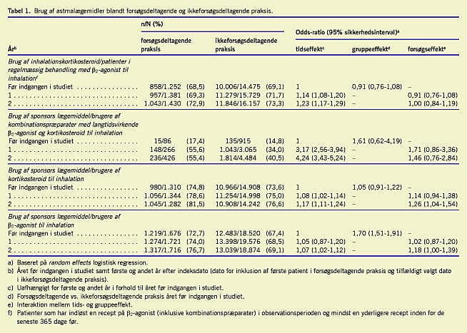 Præferencen for sponsors kombinationspræparat med langtidsvirkende inhalations-β2 -agonist og kortikosteroid (Symbicort) steg fra 17,4% til 55,4% blandt praksis, der deltog i forsøget, og fra 14,8% til 40,5% blandt ikkedeltagende praksis. Effekten af deltagelse var ikke statistisk signifikant. For både forsøgsdeltagende praksis og kontrolpraksis sås der en stigende præference for sponsors inhalationskortikosteroider, og der var en statistisk signifikant effekt af at deltage i forsøget med en OR på 1,26 (95% SI: 1,04-1,54). Ligeledes var der en stigende præference for ordination af sponsors inhalations-β2 -agonist i begge grupper og en effekt af at deltage i forsøget med OR 1,18 (95% SI: 1,00-1,39). Sponsors andel af den totale mængde ordineret astmamedicin steg statistisk signifikant med 6,7 procentp oint mere blandt de deltagende praksis end blandt kontrolpraksis (Tabel 2 ).