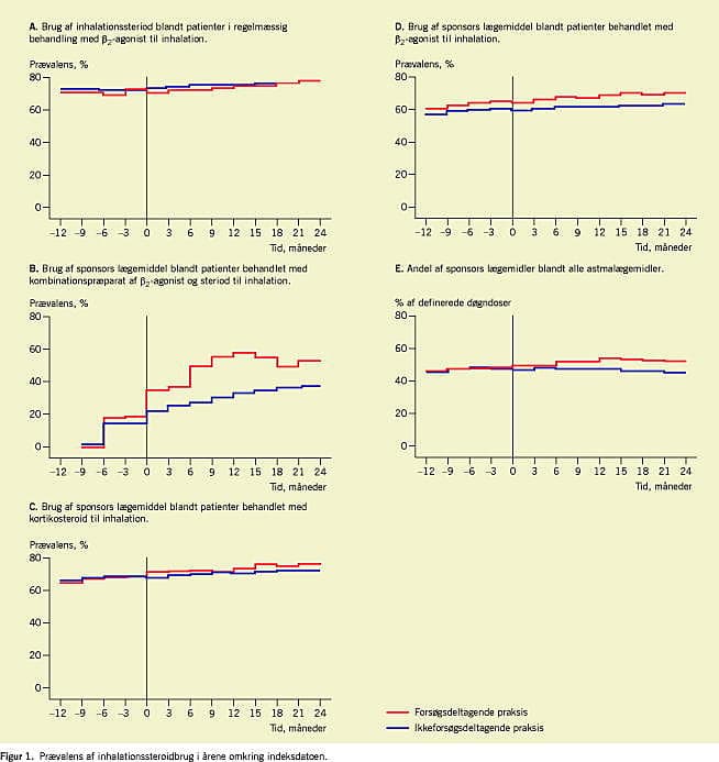 I et retrospektivt kohortestudie blev det undersøgt, om deltagelse i et industrisponsoreret klinisk forsøg påvirkede ordinationsmønstret for astmamedicin. Ti praksis, der deltog i forsøget, blev sammenlignet med 165 kontrolpraksis. Der var ingen effekt af deltagelse i forsøget på efterlevelse af behandlingsrekommandationer, målt som prævalensen af inhalationssteroidbrug blandt patienter behandlet med inhalations-β 2 -agonister. Deltagelse i forsøget medførte en øget anvendelse af sponsors lægemidler.