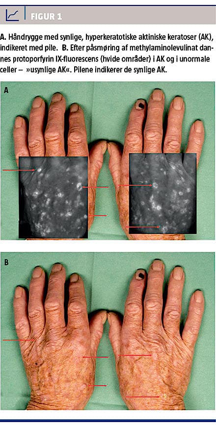 af at behandle ikke kun synlige AK, men også den mellemliggende hud. Ved måling af protoporfyrin IX-fluorescens i huden efter topikal applikation af methylaminolevulinat er det tydeligt, at der ud over de synlige AK er mange flere, der er usynlige (field cancerization). Det er derfor relevant at behandle store hudområder og ikke bare hyperkeratotiske, enkeltstående AK (Figur 1). Vælger man kun at behandle enkeltstående AK, vil der meget hurtigt opstå nye behandlingskrævende AK [10].