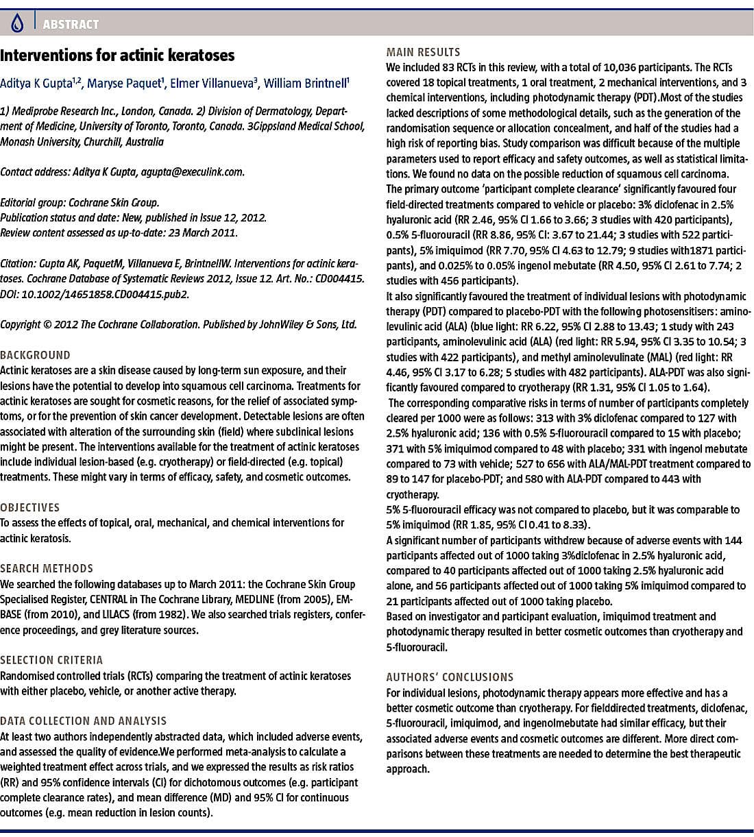 os om, hvor mange ud af 100 personer med adskil-lige AK der kureres, ser forholdet således ud (data fra Cochranereview): 1) Fotodynamisk terapi med 5-aminolevulinsyre eller methylaminolevulinat angives at kurere omkring 59 personer ved én behandling udført af en læge. 2) Ingenolmebutat kurerer omkring 33 personer ved hjemmebehandling i 2-3 dage. 3) 5-fluorouracil 5% kurerer > 37 personer ved behandling 2 × daglig i ca. 20 dage. 4) Imiquimod kurerer omkring 37 personer ved ca. 28 dages behandling, 3 × ugentlig. 5) Diclofenac kurerer ca. 31 personer ved 90 dages behandling, 2 × daglig.