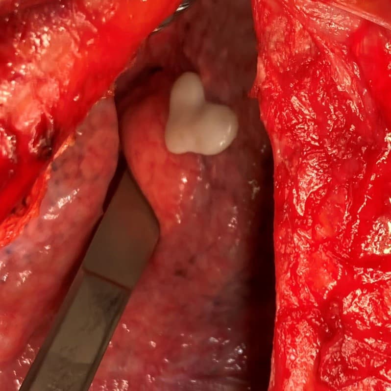 Under operationen blev der fundet en besynderligt formet lille plade af hyaloserositis i pleura. Pladen sad fast på pleura viscerale, og det usædvanlige syn af den perfekte hjerteform medførte næsten julestemning på operationsstuen.