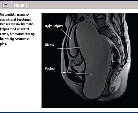 Patienten fik den efterfølgende dag foretaget en magnetisk resonans-skanning, der viste ophobning af menstruationsblod i vagina, uterus og højre salpinx (Figur 1). Senere samme dag fik hun foretaget hymenektomi med udtømning af ca. 800 ml brunligt, gammelt blod. Efterforløbet var ukompliceret, og patienten blev udskrevet dagen efter.
