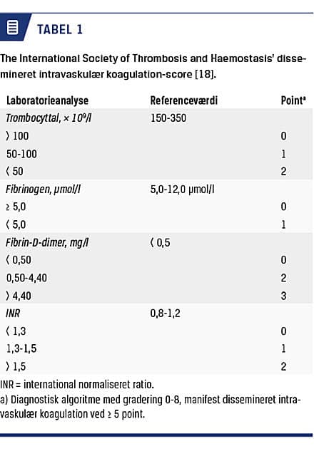 er lavet af International Society on Thrombosis and Haemostasis er anerkendt til anvendelse i klinisk praksis. Dette scoringssystem er baseret på en diagnostisk algoritme, som graderes fra 0 til 8, hvor > 5 defineres som manifest DIC (Tabel 1).