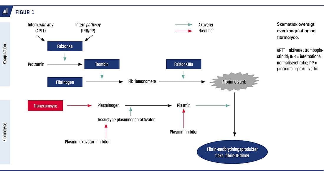 Ved svære traumer synes både sympatoadrenal aktivering, inflammation og hypoksi at øge ekspressionen af trombomodulin [13]. Dette igangsætter en profibrinolytisk kaskade, hvor øget mængde trombomodulin binder sig i et kompleks med cirkulerende trombin [14]. Dette trombomodulin-trombin-kompleks aktiverer protein C, som ud over at hæmme koagulationsfaktorerne Va og VIIIa også opregulerer plasmin [10, 15] (Figur 1). Derudover secerneres vævsplasminogenaktivator (tPA) fra endotelet som respons på frigivelse