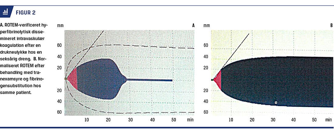 I Figur 2 ses et klassisk eksempel på et ROTEM-resultat ved hyperfibrinolytisk DIC efter en drukneulykke. ROTEM-resultatet stammer fra en seksårig dreng, som blev bragt ind efter at være fundet druknet