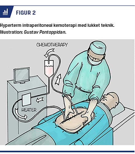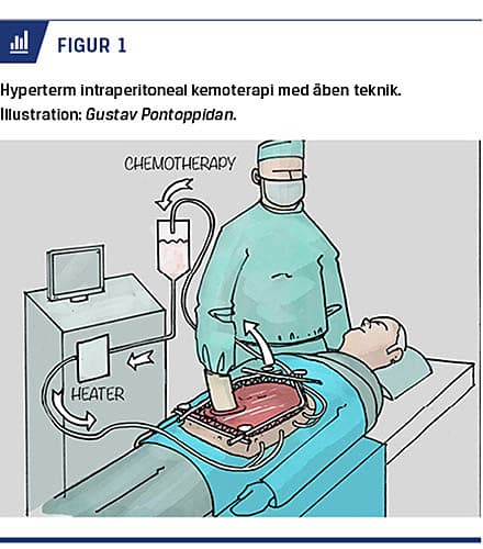 I Danmark er CRS og HIPEC centraliseret til ét center på Kirurgisk Afdeling på Aarhus Universitetshospital. Centeret er på niveau med internationale centre og har sammenlignelig femårsoverlevelse og morbiditet for indgrebet [13, 14]. Som udgangspunkt tilbydes behandlingen ikke til patienter med en fysiologisk alder over 75 år, betydelig komorbiditet (American Society of Anesthesiologists (ASA) > 2), spredning uden for peritoneum samt invasiv vækst af tumor til visse områder og organer [15]. HIPEC kan desuden kun tilbydes, når alt tumorvæv skønnes at kunne fjernes makroskopisk ved CRS [15].