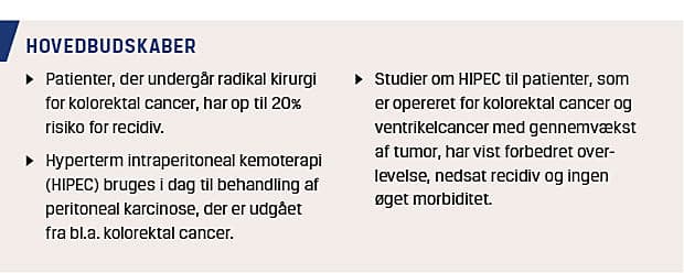Hvert år får mere end 5.000 danskere konstateret kræft i colon eller rectum. Hos en ud af fem af disse patienter debuterer sygdommen i form af fjernmetastaser [1]. Efter kirurgi med kurativt sigte får op til 20% recidiv af sygdommen enten lokalt eller i form af fjernmetastaser [2]. Cytoreduktiv kirurgi (CRS) efterfulgt af hyperterm intraperitoneal kemoterapi (HIPEC) tilbydes i dag til selekterede patienter med metastaser til bughinden (peritoneal karcinose). CRS består af makroskopisk fjernelse af al tumorvæv fra bughinden og af karcinoseelementer på organer. Behandling med CRS og HIPEC har over de seneste ti år forbedret overlevelsen markant for patienter med peritoneal karcinose [3-5]. Der findes nye studier, hvis resultater indikerer, at HIPEC kan have en plads som forebyggende behandling af peritoneal karcinose i relation til den primære operation hos patienter uden peritoneal karcinose [6].