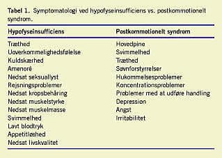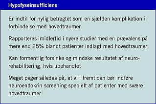 Hovedtraumer er hyppigt forekommende og fører i Danmark til ca. 150 indlæggelser pr. 100.000 indbyggere pr. år [1]. En væsentlig del af patienterne får kroniske fysiske, psykiske eller kognitive sequelae. Typisk diagnosticeres kognitive og neuropsykiatriske posttraumatiske symptomer som postkommotionelt syndrom eller posttraumatisk demenssyndrom. Der er en væsentlig symptomhomologi mellem disse posttraumatiske syndromer og hypofyseinsufficiens (Tabel 1 ), og det er ydermere velkendt, at hypofyseinsufficiens kan udvikles som komplikation til hovedtraumer. Posttraumatisk hypofyseinsufficiens betragtes som sjældent forekommende, og traumepatienter får derfor ikke rutinemæssigt foretaget neuroendokrin udredning. De seneste par år har der imidlertid været øget fokus på, om udiagnosticeret hypofyseinsufficiens kunne være en del af årsagen til de kognitive og neuropsykiatriske sequelae hos patienter med hovedtraume. I denne statusartikel refereres kun til voksne, da der foreligger meget sparsomme data vedrørende børn.