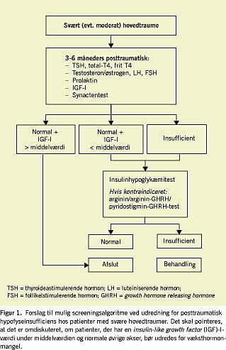 På grund af de hyppige forandringer i de biokemiske markører i det akutte forløb og rapportering om, at hypofyseinsufficiens diagnosticeret i den subakutte fase kan normaliseres i løbet af de første posttraumatiske måneder, forekommer det rimeligt at vente 3-6 måneder med at foretage neuroendokrin udredning. Udredningen bør dog foretages tidligere, hvis dette findes klinisk indiceret. En integreret evaluering af hypothalamus/hypofysefunktionen er resursekrævende, og set i lyset af den høje incidens af hovedtraumer er der behov for en rationel tilgang. Ved en målrettet screening vil valg af undersøgelser afhænge af lokale retningslinjer for udredning af hypofyseinsufficiens. En potentiel algoritme er vist i Figur 1 . Ved normale prøvesvar og aldersjusteret insulin-like growth factor (IGF)-I > middelværdien kan patienten betragtes som sufficient, og behandlingen kan afsluttes. Ved normale testudfald og IGF-I < middelværdien eller ved biokemiske tegn på insufficiens på en eller flere af de øvrige hypofysehormonakser anbefales det at supplere med ITT til evaluering af det integrerede ACTH- og væksthormonrespons. Alternativt kan der anvendes direkte stimulationstest til vurdering af væksthormonproduktionen (arginin/pyridostigmin + growth hormone-releasing hormone (GHRH)-test) og binyrebarkfunktionen (SST). Dog udelukker et normalt respons ved SST ikke ACTH-mangel de første tre måneder posttraumatisk.