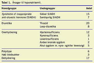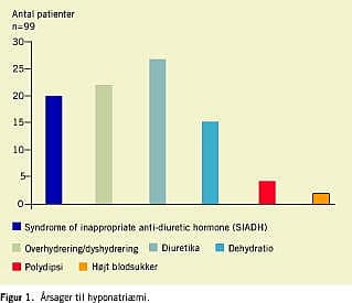 Materiale og metoder: I en firemånedersperiode blev akut indlagte medicinske patienter med plasmanatrium < 130 mmol/l grundigt udredt for at fastslå årsagen til hyponatriæmi. Den endelige årsag blev for hver enkelt patient fastlagt ved konsensus i en projektgruppe bestående af en nefrolog, en geriater, en endokrinolog og to yngre læger. I alt 99 patienter indgik i undersøgelsen.