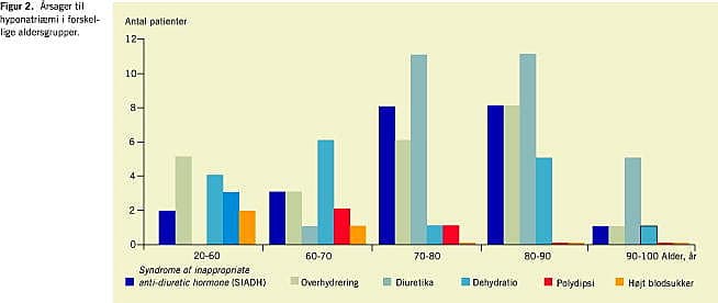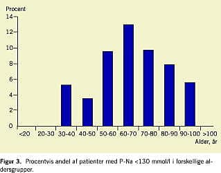 Resultater: Af alle akut indlagte patienter på medicinsk modtageafsnit havde 7,4% plasmanatrium < 130 mmol/l. De store årsagsgrupper var: syndrome of inappropriate anti-diuretic hormone (SIADH) 22%, sygdom med overhydrering (hjerte-, nyre-, eller leverinsufficiens) 23%, behandling med thiazid 20%, dehydrering 17% og behandling med loop-diuretika 8%. Den aldersrelaterede incidens steg frem til 70-års-alderen og herefter var den atter faldende. Næsten halvdelen af patienterne (49%) havde tidligere været indlagt med plasmanatrium < 130 mmol/l.