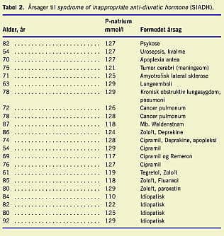 Årsagerne til SIADH fremgår af Tabel 2 . Der hvor medikamenter er opfattet som årsag, har det i enkelte tilfælde ikke kunnet lade sig gøre at seponere det formodede skadevoldende stof, og man har således i disse tilfælde ikke den endelige bekræftelse på, at det pågældende medikament har været årsag.
