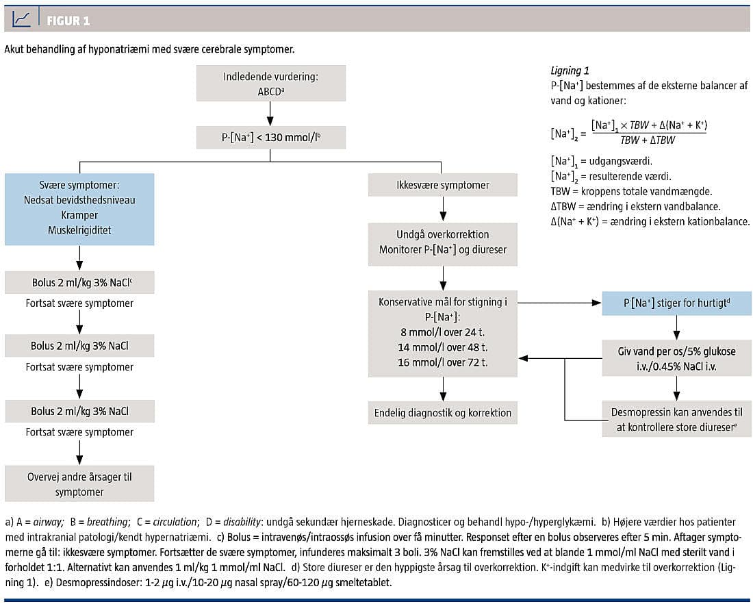 3) bolusterapi med hypertonisk NaCl er en enkel og effektiv behandling, der giver en hurtig og kontrollabel øgning af P-[Na+]. Den indledende behandling skal tage udgangspunkt i patientens symptomer. Svære symptomer ved hyponatriæmi skyldes primært hjerneødem forårsaget af den relative nedsættelse af P-[Na+]/plasma-osmolalitet [4]. Sker faldet langsomt, har hjernen tid til at kompensere, og der udvikles ikke svære symptomer. Imidlertid kan patienter med længerevarende hyponatriæmi få akut forværring, hjerneødem og svære symptomer. Derfor er hyponatriæmiens formodede varighed ikke afgørende for den indledende behandling [1, 2]. Fraset hyponatriæmi pga. ekstracellulær fortynding ved hyperglykæmi (P-[Na+] falder ca. 0,4 mmol/l pr. mmol/l stigning i P-[glukose]) er hyponatriæmiens ætiologi ikke afgørende for den akutte behandling [4]. OD er skade i hjernens hvide substans og er associeret med korrektion af hyponatriæmi med mere end 10 mmol/l over 24 timer [1]. Derfor indgives der maksimalt tre boli a 2 ml/kg 3% NaCl med en kontrollabel stigning i P-[Na+] på 6 mmol/l [5]. Efterfølgende er det vigtigste at undgå overkorrektion, så risikoen for OD reduceres [1].