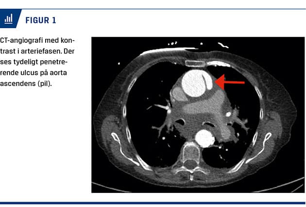 En CT-angiografi viste en ulceration i aorta ascendens (Figur 1) med indikation for thoraxkirurgisk intervention. Patienten blev vurderet som værende habil, fraset minutterne omkring det kliniske hjertestop. Hun ønskede ikke operation, trods information om højere mortalitetsrisiko ved konservativ behandling. Hun blev overflyttet til en thoraxintensiv afdeling til videre behandling i form af stram blodtrykskontrol, således at risikoen for yderligere perforering blev reduceret. Hun blev udskrevet i velbefindende på 12. dagen og var fortsat i live 36 måneder senere.