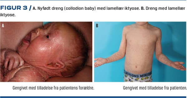 Lamellær iktyose og kongenit iktyosiform erytrodermi er begge sjældne sygdomme med en prævalens under 1:100.000 [3]. De er begge tilstede ved fødslen. Børnene fødes ofte præmaturt og er indkapslet i et gennemsigtigt lag, som kaldes collodion membrane, og barnet beskrives som en collodion baby (Figur 3) [3, 15]. Gradvist afstødes membranen, og ved lamellær iktyose udvikles der store barklignende skæl på hele kroppen, mens kongenit iktyosiform erytrodermi i højere grad er kendetegnet ved generaliseret erytrodermi og mildere skældannelse [16]. Skællene kan være både lyse og mørkebrune med central adhæsion og hvælvede kanter, hvilket resulterer i epidermal fissurdannelse [3, 16]. Ansigtshuden er ofte ekstremt stram, hvilket medfører ektropion, eklabium og vækstforstyrrelser i den nasale og aurikulære brusk [3]. Som ved ichthyosis vulgaris ses der palmoplantar involvering med varierende grad af keratoderma og hyperlinearitet [3]. Andre symptomer er keratitis, negledystrofi, cikatriciel alopeci, hypohidrose og obstruktivt høretab pga. skælophobning i øregangen [2, 3]. Ingen af sygdommene bedres i sommerhalvåret [3].Der er ingen diagnostiske histologiske fund [3].