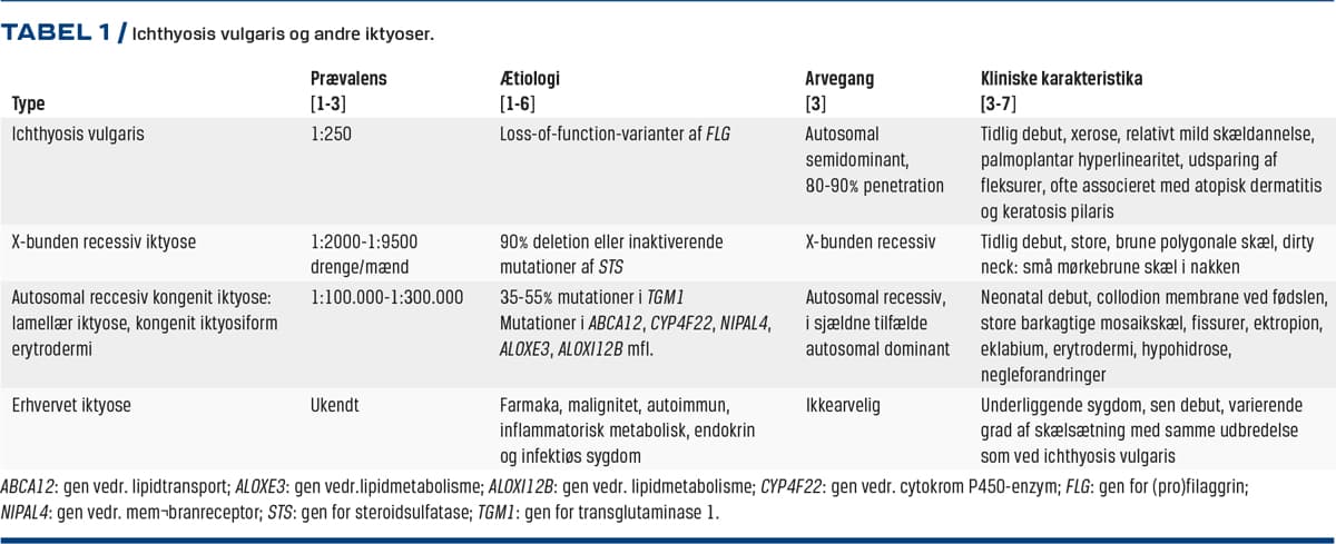 Ichthyosis vulgaris er en relativt almindelig og genetisk betinget hudsygdom, som tilhører gruppen af iktyoser. Denne sygdomsgruppe er karakteriseret ved xerose og dannelse af polygonale skæl og har sit navn fra det græske ord for fisk, ichthys, pga. den afficerede huds lighed med fiskeskæl. Iktyose ses hyppigst i arvelige former med forskellige arvegange, og tilfælde af iktyosehos en patient uden familiehistorie for sygdommen bør lede tankerne i retning af enten recessiv sygdom, nyopstået dominant mutation eller erhvervet iktyose. Iktyosernes mange fællestræk nødvendiggør et nøje kendskab til den enkelte types karakteristika, hvis den rette diagnose skal stilles klinisk. Selv for hudlæger med erfaring med iktyose kan denne sygdomsgruppe frembyde differentialdiagnostiske vanskeligheder. I dag kan præcis diagnostik opnås ved molekylærgenetisk undersøgelse. I det følgende gennemgås de kliniske træk ved ichthyosis vulgaris og de mest relevante differentialdiagnoser til denne lidelse (Tabel 1).