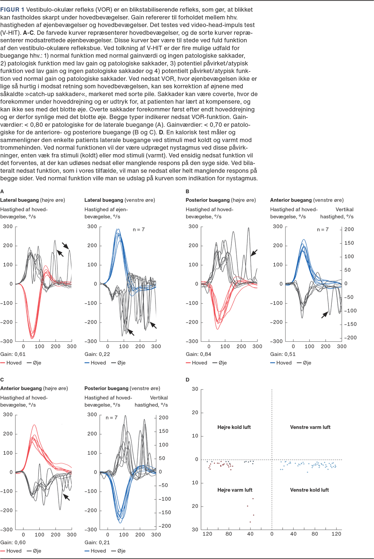Her genfandt man en tydelig usikker balance samt lidt bredsporet gang. Der var ingen spontan nystagmus, men undersøgelse af VOR med V-HIT (Figur 1 A-C) viste nedsat gain, dvs. forholdet mellem hastigheden af hhv. øjenbevægelser og hovedbevægelser, i fem af seks buegange i ligevægtsorganerne.