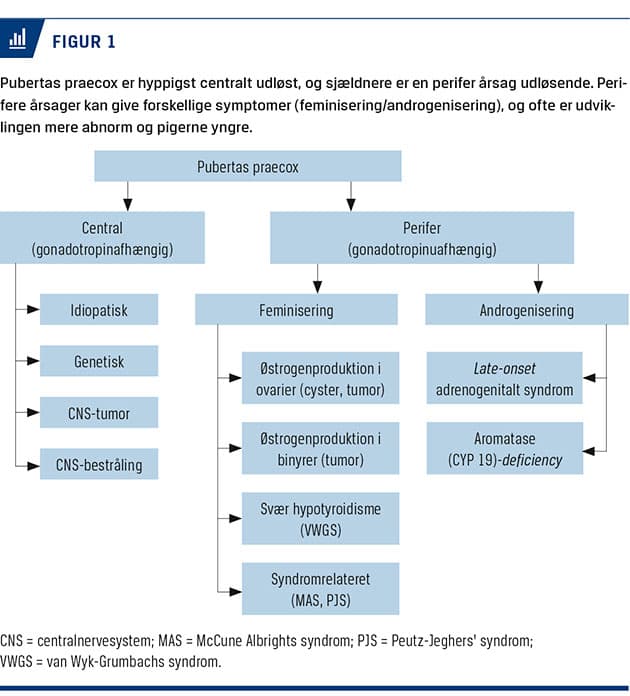 Hos piger er definitionen på pubertas praecox (PP) brystudvikling før otteårsalderen [1]. PP er væsentligt hyppigere hos piger end hos drenge (8:1) [2]. I 2001 var prævalensen i Danmark 1:500 [3]. Flere studier har vist, at piger i dag er yngre ved pubertetens indtræden end tidligere [4-6]. Afroamerikanske og latinamerikanske piger går tidligere i pubertet end kaukaside piger, og internationalt adopterede piger har også en øget risiko for tidlig pubertetsudvikling [7]. Ud over associationen til etnicitet mener man, at bedre levestandard, ernæring og overvægt er medvirkende årsager til den øgede forekomst [4, 5, 8].